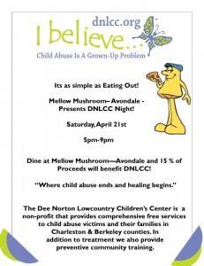 Tomorrow night (Saturday) Mellow Mushroom Avondale will be hosting a charitable event – 15% of proceeds will go towards The Dee Norton Lowcountry Children’s Center. Check out Mellow’s FACEBOOK PAGE for more details.
