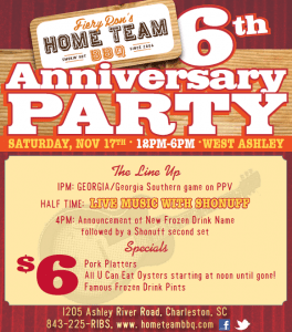 Home Team BBQ is about to celebrate their 6th Anniversary in the best way they know how – with football, food, booze and live music. The restaurant will be showing the Georgia football game against Georgia Southern on Saturday, November 17th, while serving up discounted dishes to patrons. When halftime arrives, Shonuff will provide the entertainment.Be sure to hang around after the game because Home Team will announce the winner of the drink-naming contest they held. Plus, Shonuff will play again.