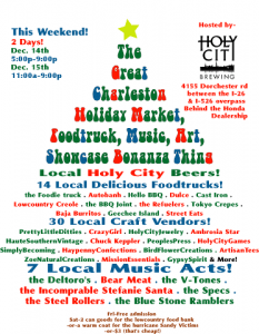 The title may be a mouthful, but an event that spreads out over two days deserves such a title. The Great Charleston Holiday Market, FoodTruck, Music, Art Showcase Bonanza Thing will take place on Friday and Saturday (12/14-15) at Holy City Brewing. There will be food trucks, live music, beers, and vendors – all of which will be locals! There will also be keg tossing, Lowcountry food bank collection, tarot card readings, local holiday crafts and kids activities.