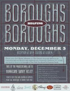 Multiple restaurants from the Cannonborough and Elliotborough neighborhoods are teaming up to help the boroughs of New York City and the rest of the Northeast effected by Hurricane Sandy. The fundraising event, Boroughs Helping Boroughs, takes place tomorrow (Monday, 12/3) at The Grocery on 4 Cannon Street.