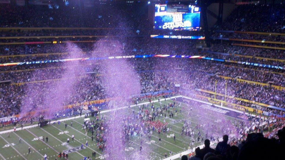 A few seconds later, I saw the Giants sideline erupt. It was over. The field was flooded with people. Confetti blasted up into the air and streamers fell from the ceiling.