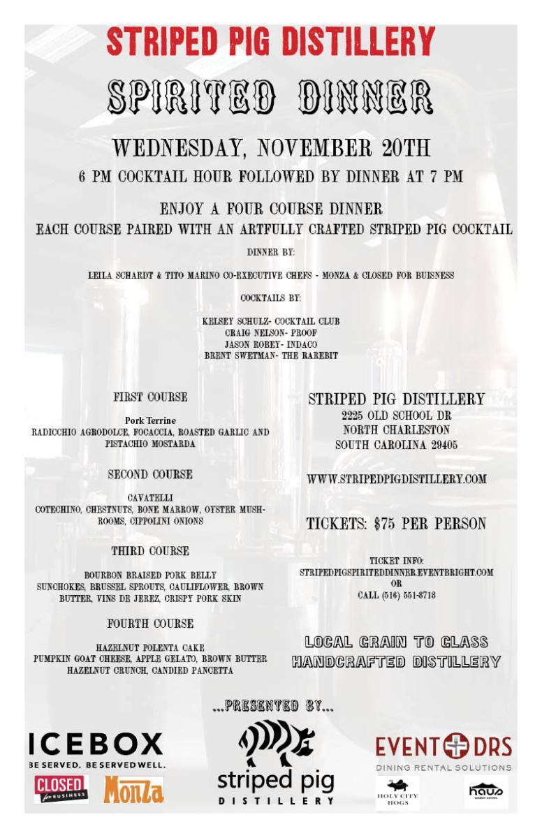 The Striped Pig Distillery is hosting a “Spirited Dinner” tomorrow beginning with a cocktail hour at 6 pm. Dinner follows at 7 pm.