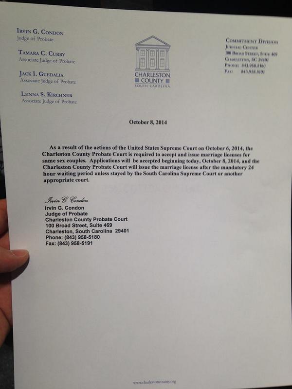 Below is a picture of Judge Condon’s statement announcing he will grant marriage licenses to same sex couples (credit Tyler Jones, @TylerMJones via Brady Quirk-Garvan, @bradyqg):