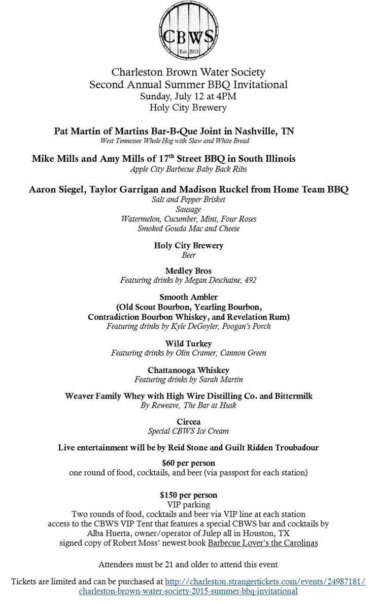 After a successful inaugural event last year, the Charleston Brown Water Society (CBWS) is bringing back the Summer BBQ Invitational on Sunday, July 12th. The “whiskey-focused, non-profit” organization will once again host the party at Holy City Brewing at 4 pm.