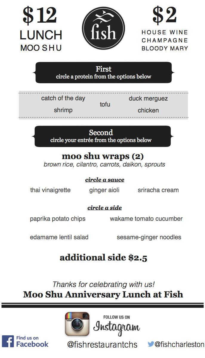On August 7th, Fish Restaurant will host its Moo Shu Anniversary Lunch. Patrons will be able to enjoy a $12 lunch menu with options for alcoholic beverages and extra sides. The menu is on the right. More details can be found here.-
