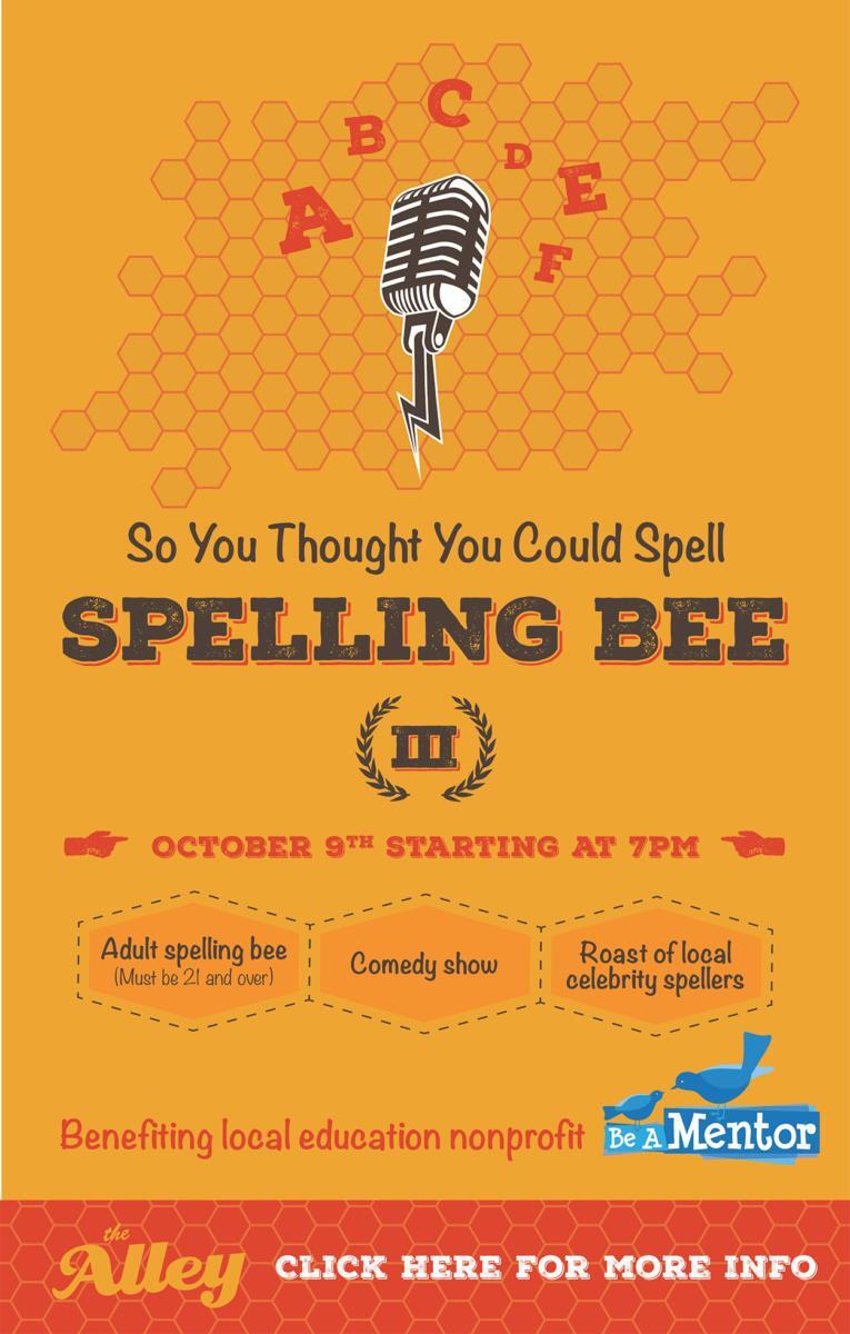 That’s right! On Friday, October 9th, The Alley will host the 3rd Annual “So You Thought You Could Spell” Spelling Bee. The event is part spelling bee, part comedy show, and part local celebrity roast. Regardless of what you call it, it will be quite the party. Plus, the entire shindig will benefit Be A Mentor, a local education nonprofit. Oh, and for the second straight year I’ll be one of the participants!