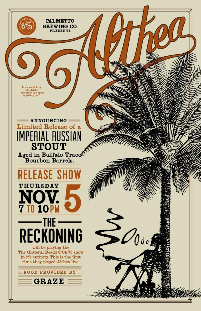 Tomorrow, the Palmetto Brewing Company will celebrate the release of a new, limited-edition beer called Althea. The Special Bottle Release Show will take place from 7 t0 10 pm at the brewery’s Huger Street headquarters.
