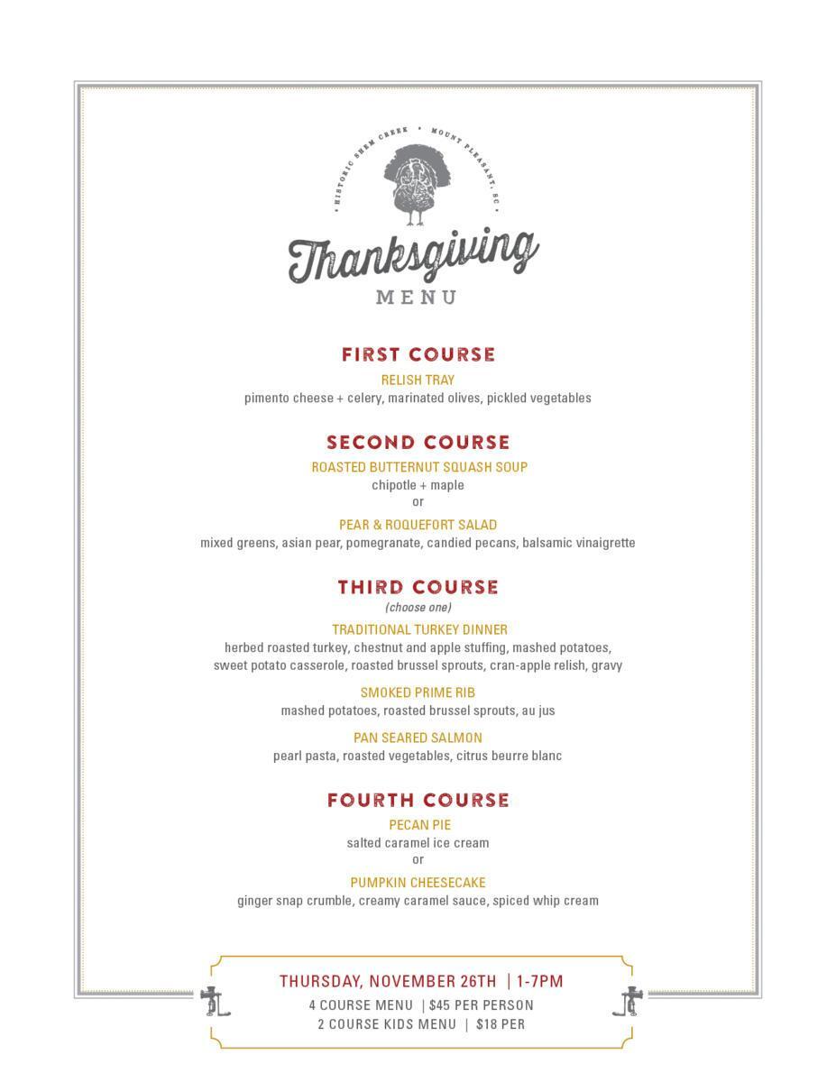 - Tavern & Table: Open 1 pm – 7 pm, 4 course menu ($45 per person; 2-course kids menu for $18 per child). See the menu here. 843-352-9510.
