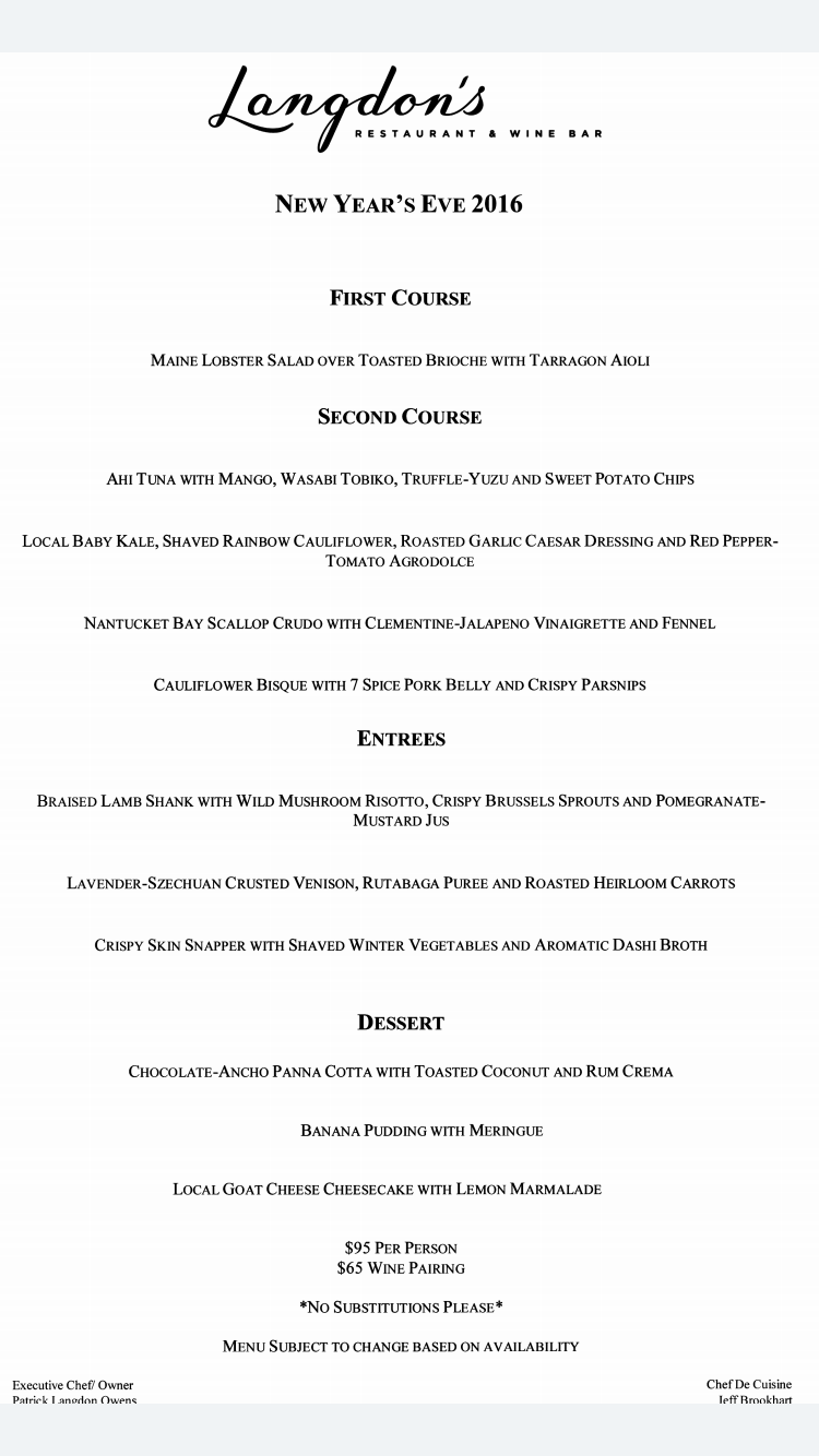 Langdon’s will have a special four-course dinner for $95 per person. Wine pairings are available for an additional $65. Here’s the menu: