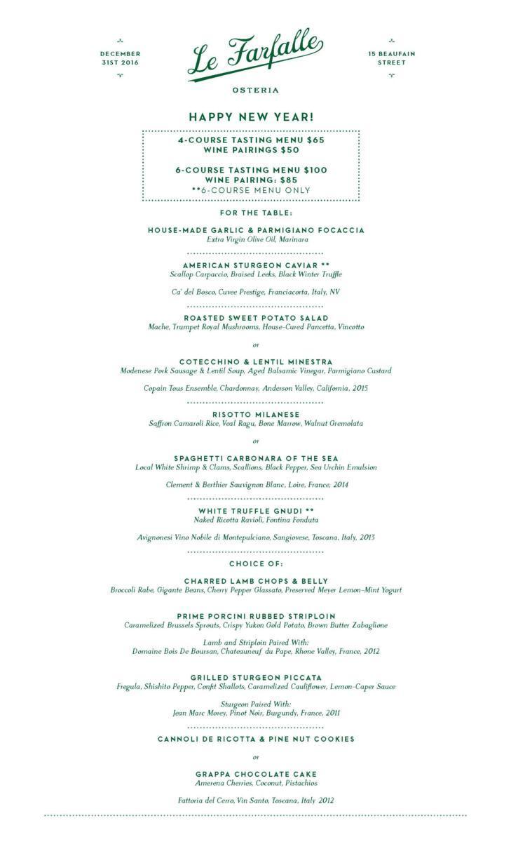 Food Take a Peek at Le Farfalle’s New Year’s Eve Menu Published 9 years ago on December 20, 2016 By Holy City Sinner This New Year’s Eve, Le Farfalle will be open for their normal business hours and will offer two dining options: 4-course Tasting Menu for $65 (wine pairing is $50 extra) 6-course Tasting Menu for $100 (wine pairing is $85 extra) You can see the full menu below: Share on FacebookTweetFollow us Related Topics:Le Farfallenew year's eve Up Next Opal and Langdon’s Release New Year’s Eve Menus Don't Miss Tavern & Table Running Social Giving Campaign Click to comment Leave a Reply Cancel replyYour email address will not be published. Required fields are marked *Comment * Name Email Website Follow Us Subscribe to HCS Subscribe to our mailing list Search PatreonAds HCS Sponsors Ads Events Weekend Preview2 years ago Charleston Weekend Events There’s ALWAYS something to do in Charleston – especially on the weekend. If you need help finding plans, just consult... Events2 years ago Explore Charleston & Children’s Museum of the Lowcountry Unveil The Charleston Santa Events2 years ago Waterfront Ice Skating Rink to Return to Charleston Harbor Resort & Marina Events2 years ago Miracle Holiday Pop-Up Bar Returns to Handcraft Kitchen & Cocktails This Month Events2 years ago Big Brothers Big Sisters hosts BIG Lowcountry Boil Events2 years ago Comedy Legend Katt Williams Returns to the North Charleston Coliseum in March Events2 years ago Parade, Vendor Applications Open for Upcoming ‘Holiday Magic’ Events Events2 years ago “Know Whatcha’ Know” Release Party & Fashion Show Set for Saturday Events2 years ago High Tide Music & Arts Festival Coming Back to Charleston for Third Year More Events
