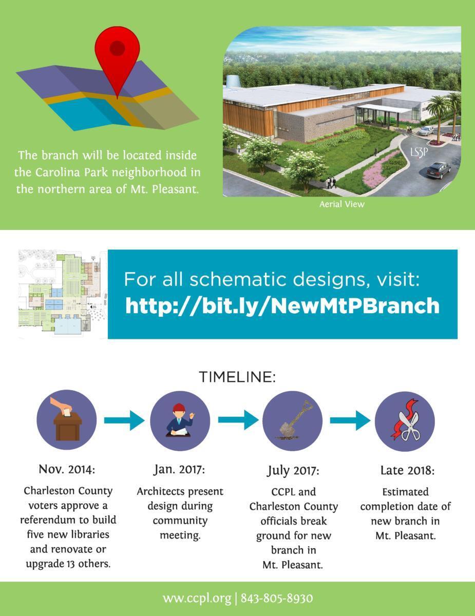 Carolina Park Development donated the land for the facility, along with $1.2 million toward its construction. The branch is expected to open in late 2018. Local residents approved a referendum to build five new libraries, and renovate or upgrade 13 others in November 2014. The first phase of the overall project was designed to solicit community input for the five new library locations. One of CCPL’s top priorities during this process involved obtaining practical information from public library users. During fall 2015, community meetings were held in each region slated to receive a new library facility.