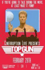 The first “Cinerruption LIVE” will feature the classic Rom/Com, Top Gun. Three of Charleston’s funniest comedians, Jason Groce, Jessica Mickey, and Hagan Ragland, will provide hilarious commentary throughout the film. Think: Mystery Science Theater 3000.