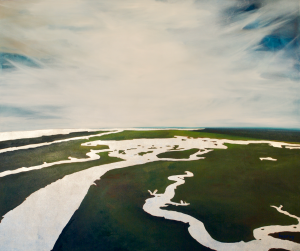 The 2018 State Fellowship award recipients from South Carolina is Charleston painter and installation artist Kate Hooray Osmond. Her work expresses bold architectural lines and bright, shiny colors. She rides in a helicopter to capture much of her subject matter: highways, agricultural structures, industrial plats, container ships, etc. to offer a new perspective of our familiar everyday existence. Energy, optimism, and the use of gold leaf are the hallmarks of Osmond’s work.