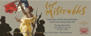 The Charleston Music Hall is once again teaming up with 39 Rue de Jean to present “Les Miserables: Dinner + Film Screening” on Thursday, March 22nd. Attendees can enjoy a 3-course prix fixe menu at 39 Rue de Jean followed by a screening of Les Miserables at the Music Hall.