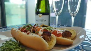 The silver garnished, all-beef, wagyu hot dog is capped with pan-seared pork belly, butter poached lobster, and a white truffle champagne aioli. Fans that really want to celebrate the RiverDogs’ milestone year in style will also be able to purchase the “175th season in dog years” package (right) that includes two Silver Anniversary Dogs, champagne bottle service, and a table for two for $175 at The Joe this season.