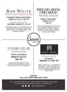 Charleston Fashion Week kicks off tonight and event sponsor Gwynn’s of Mount Pleasant is celebrating by hosting a series of trunk shows and pop up shops throughout the week.