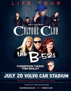 The Life Tour starring Boy George & Culture Club and The B-52s, two of the biggest pop acts in the 80s, will stop at the Volvo Car Stadium on Friday, July 20th at 7 pm. The Thompson Twins’ Tom Bailey will open the show.