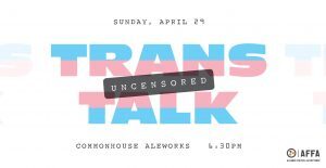 Alliance For Full Acceptance (AFFA) is hosting “Trans Talk: Uncensored,” a special event at Commonhouse Aleworks in Park Circle on Sunday, April 29th at 6:30pm. The event will feature five members of the local transgender community talking about the trans experience.