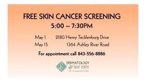 Dermatologists and certified dermatological providers from Dermatology and Laser Center of Charleston will offer free skin cancer screenings for new patients on May 1st and 15th.