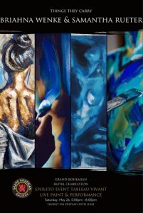 On Saturday, May 26th, local artists Samantha Rueter and Briahna Wenke will perform a live body art performance piece, “Things They Carry,” at the Grand Bohemian Hotel’s art gallery. The event is being held on the Spoleto Festival USA’s opening night and begins at 5 pm.The performance will include five live models – male and female – to act as painted living pictures, an auction for two large paintings at 7:30 pm, and more. You can view a teaser video clip for the event below.