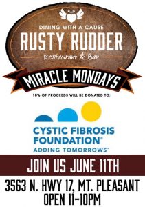 Join the Rusty Rudder for lunch, dinner, apps, or cocktails during their next Miracle Monday! On Monday, June 11th, the restaurant will donate 10% of ALL proceeds from open to close to the Cystic Fibrosis Foundation of SC!