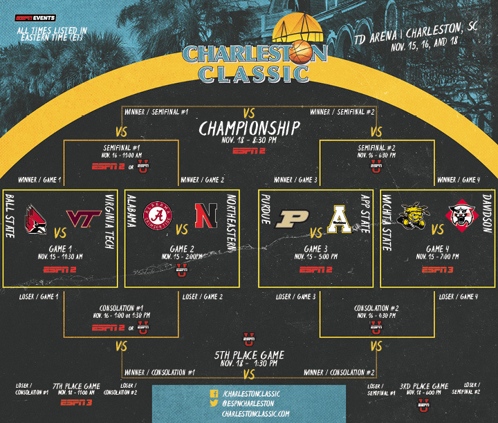 ESPN Events has revealed the bracket for the 11th Annual Charleston Classic, which will be played on November 15th, 16th, and 18th at the TD Arena in downtown Charleston. The field of eight includes five teams who played in the 2018 NCAA Tournament.