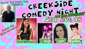 Show host Keith “Big Daddy” Dee has brought back two comedians from the very first Creekside show, Hannah Hogan and Shawna Jarrett. They’ll be joined by Sofiya Alexander and headliner Blayr Nias.