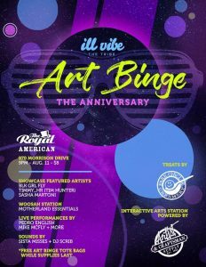 On Saturday, August 11th, IllVibeTheTribe will celebrate one year of their Art Binge series with the fifth installment of the event. Art Binge V: A Quarterly Art Market will be held at The Royal American at 9 pm.