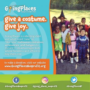 Going Places is launching their 3rd program, “give a costume. give joy.,” to provide donated, “like-new or new Halloween costumes to low-income kids whose families cannot afford to buy them one.