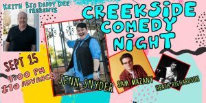Creekside Comedy Night returns on Saturday, September 15th for another killer show. Host Keith “Big Daddy” Dee, will be joined by three hilarious comedians – local funny guy Heath Richardson, Raleigh’s Sam Mazany and headliner Jenn Snyder.