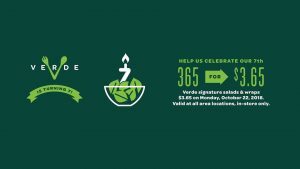 Verde will celebrate its seventh anniversary on Monday, October 22nd with a “saladbration” event from 11 am to 9 pm at all locations.