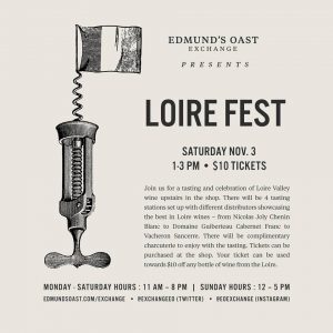 On Saturday, November 3rd, the business will host Loire Fest, from 1 pm to 3 pm. This will be a tasting and celebration of Loire Valley wine upstairs in the shop.