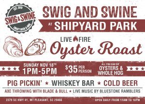 On Sunday, November 18th, Swig & Swine’s Shipyard Park location in Mount Pleasant hosts an oyster roast and pig pickin’ featuring live music, axe throwing with Blade & Bull, a full whiskey bar, and beer.