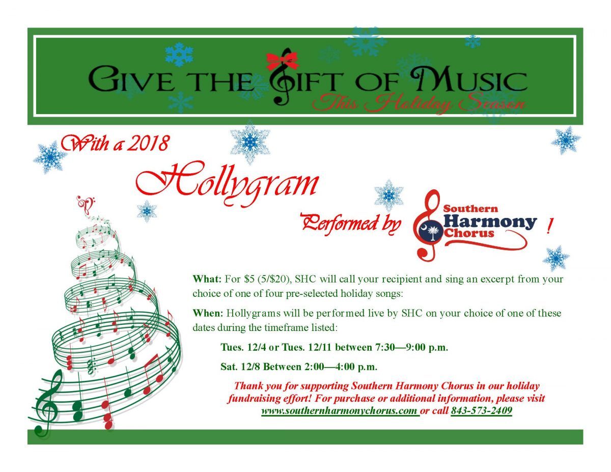 For a $5 donation per person, Southern Harmony Chorus will call your recipient and perform one of four holiday greetings live on select dates in early December. By purchasing Hollygrams, you will be supporting this local non-profit while sending an unforgettable gift.