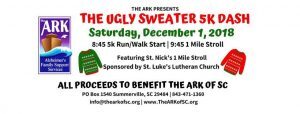 Registration is now open for The ARK’s inaugural Ugly Sweater 5K Dash in historic downtown Summerville. The 5K run and 1-mile stroll is Saturday, December 1st with all race proceeds benefiting The ARK in its work providing comprehensive support services to families living with Alzheimer’s or related dementia. Runners and walkers should wear their ugliest holiday sweater for a chance to win a local gift basket.