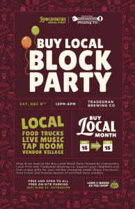 Don’t forget to help LLF celebrate this year’s campaign with the Buy Local Block Party on December 8th at Tradesman Brewing Co. in downtown Charleston. The event will feature 30 local makers, artists, and craftspeople and includes live music, food trucks, and other local, non-alcoholic beverage options.