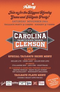 Join The Alley on Saturday for all the big college football rivalry games like Michigan vs Ohio State (noon), Auburn vs Alabama (3:30 pm), and the biggest one of them all – Clemson vs Carolina (7 pm).