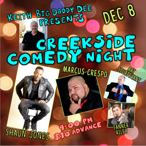 Creekside Comedy Night returns on Saturday, December 8th for another evening of hilarious stand-up. Host Keith “Big Daddy” Dee will be joined by headliner Shaun Jones, Marcus Crespo, Asheville’s Art Sturtevant, and Charleston’s own Tanner Riley.