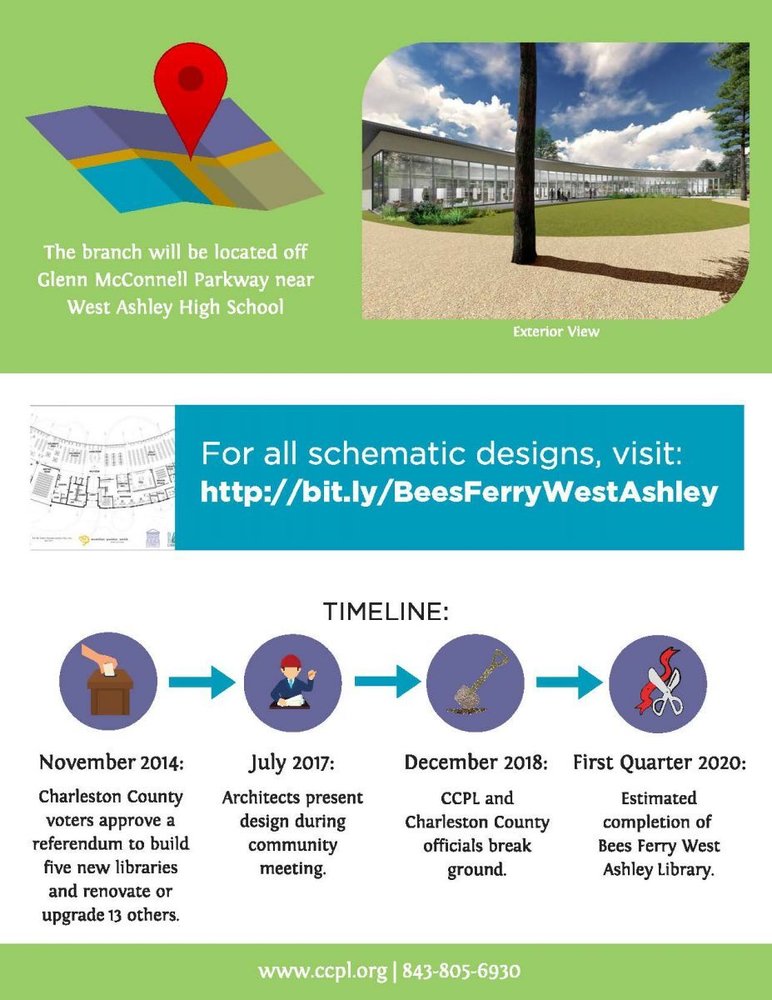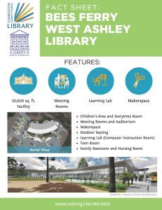 Local residents approved a referendum to build five new libraries, and renovate or upgrade 13 others in November 2014. The first phase of the overall project was designed to solicit community input for the five new library locations. One of CCPL’s top priorities during this process involved obtaining practical information from public library users. The McMillan Pazdan Smith architectural firm presented their design of the new branch during a community meeting in July 2017. Visit bit.ly/BeesFerryWestAshley to see the design (high resolution images available upon request).