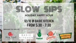 On Monday, December 10th, Slow Food will host their Holiday Slow Sips Happy Hour. The event will take place on the patio at Basic Kitchen from 5:30 pm to 7:30 pm and is sponsored by Camellia’s Beans and Meatless Monday in conjunction with Slow Food’s annual celebration of Terra Madre day.