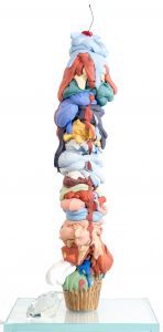 Oversized diamonds, Hot Wheels, and splashes of glitter adorn generous heaps of frosting. Olivia Bonilla’s cupcakes have always rebelled against the norm with a sweet and sour attitude: defiant, proud, and now a bit taller than before. Bonilla’s latest cupcakes are stacked in skyscraper fashion into a tower of cement “icing.” One might question the unconventional size and scale of her sculptures. With Bonilla’s healthy dose of whimsy, these cupcakes can’t take themselves too seriously. The artist explains, “There’s a feeling of exaggerated indulgence, playing with the theme ‘over the top.’ The kid in all of us that wants to mound their ice cream to the sky.” Gypsum cement bridges the gap between painting and sculpture for the artist. Bonilla must sculpt each quickly before the material hardens. While cement could be seen as masculine, Bonilla’s cupcakes are juicy and feminine. You’ll want to look at these extravagant confections from every angle.