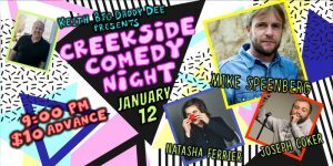 Creekside Comedy Night returns on January 12th for another evening of hilarious stand-up. Host Keith “Big Daddy” Dee will be joined by headliner Mike Speenberg, Natasha Ferrier, and Charleston’s own Joseph Coker. The show starts promptly at 9 pm.