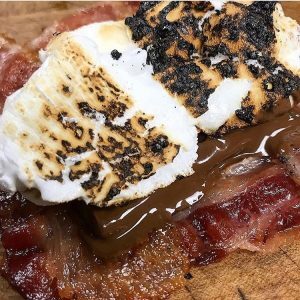 Pairings will be available from 5 pm through 9 pm for those who purchase a ticket at www.rustybullbrewing.com/tickets and then while supplies last for walk-ups. Food includes: Bacon Burnt Ends, Bacon Pastrami Sliders, Bacon Corn Dogs, and the aforementioned Bacon Weave S’mores (below).