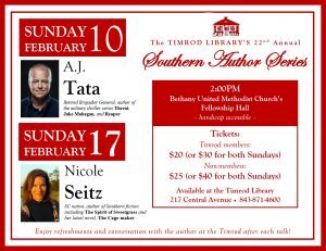 Acclaimed novelists A.J. Tata and Nicole Seitz will be the featured speakers at the 22nd Annual Southern Author Series sponsored in February by the Timrod Library in Summerville.