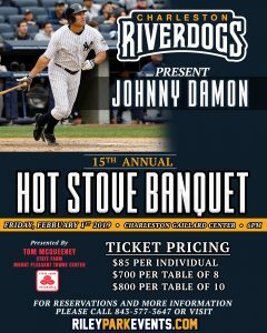 For fans who want to get even closer to the action, on sale now are a limited amount of Meet and Greet tickets sponsored by Kickin’ Chicken. The Meet and Greet with Johnny Damon and Justin Smoak will take place at The Charleston Gaillard Center from 4:30-5:30pm, preceding the official event. Tickets are available online now at RileyParkEvents.com. A combination ticket to the Meet and Greet and the Hot Stove Banquet is $135, and a ticket to the Banquet only are $85. To add a Meet and Greet ticket to an existing Banquet ticket, please contact the RiverDogs box office directly at 843-577-3647.