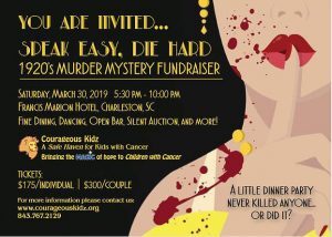 On Saturday, March 30th, Courageous Kidz, a local organization that helps kids and families affected by childhood cancer, will host a 1920’s themed murder mystery and dinner party fundraiser in downtown Charleston.