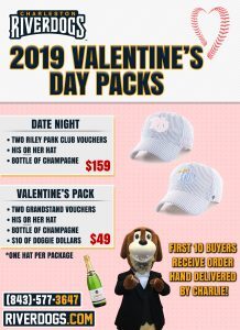 For $49, fans can purchase the “Valentine’s Day Pack” for their baseball-starved significant other, including a pair of grandstand level ticket vouchers, a RiverDogs hat, bottle of champagne, and $10 worth of Doggie Dollars, in-stadium cash at The Joe.