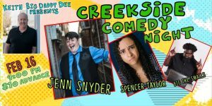 Creekside Comedy Night returns on Saturday, February 16th for another evening of hilarious stand-up. Host Keith “Big Daddy” Dee will be joined by headliner Jenn Syder and featured comedians Spencer Taylor and Isaac “Big Ike” Smalls. The show starts at 9 pm.