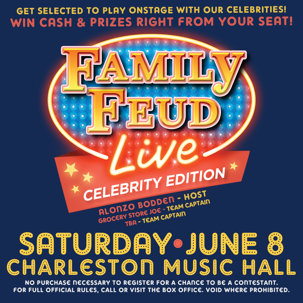 The Charleston Music Hall will host Family Feud Live – Celebrity Edition on Saturday, June 8th at 8 pm. During the event, celebrity team captains will randomly-select audience members to become a part of their on-stage “family.” Attendees can also win prizes right from their very own seat in the audience!