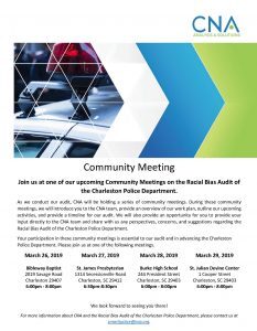 Representatives from CNA, a nonprofit research and analysis organization hired by the city of Charleston to conduct a Racial Bias Audit of the Charleston Police Department, will host a series of community meetings in March to introduce citizens to the CNA team, provide an overview of their work plan, outline upcoming activities, and provide a timeline for the audit. The meetings will also include an opportunity for public input, where citizens are invited to share their perspectives, concerns, and suggestions regarding the audit.